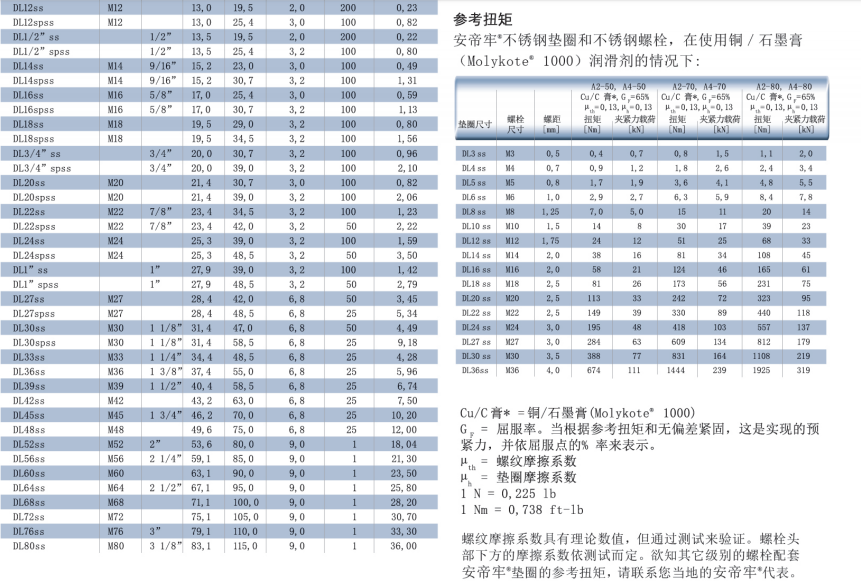 不銹鋼墊圈(EN 1.4404 / AISI 316L),DL3SS—DL42SS(標(biāo)準(zhǔn)尺寸)和DL45SS—DL80SS(根據(jù)要求定制)。